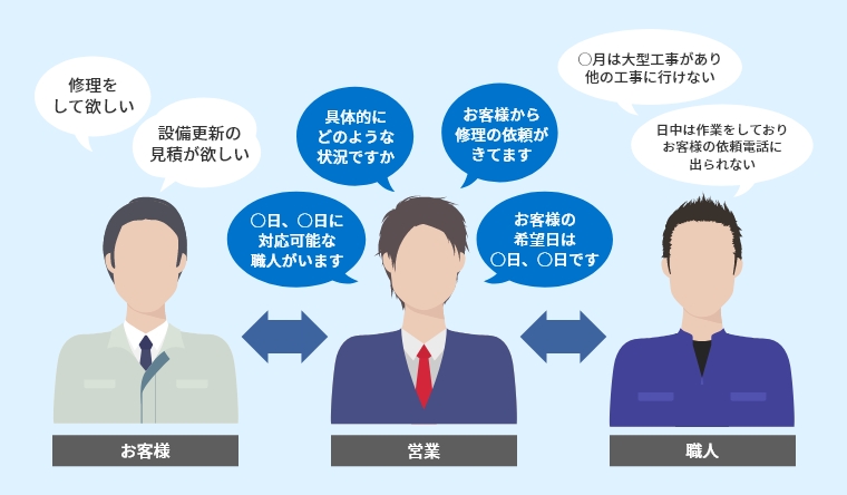 機器設置や配管工事を担当する「管工事業(職人)」と「営業部門」を分けることで、お客様のニーズを的確に捉え
